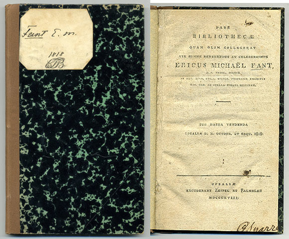 Pars bibliothecæ quam olim collegerat vir summe reverendus et celeberrimus Ericus Michaël Fant s.s. theol. doctor in reg. acad. Upsal. histor. professor emeritus reg. ord. de stella polari membrum. Sub hasta vendenda Upsaliæ d. X octobr. et sequ. 1818.