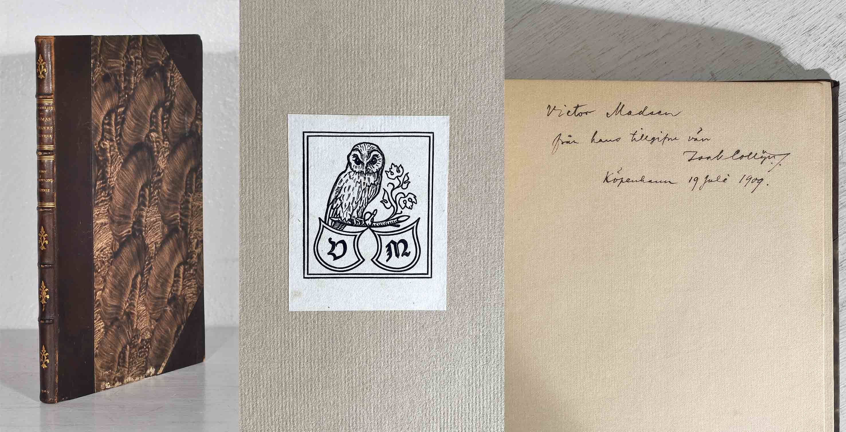 Uppsala, 1909. 73 s. & 4 plr. Tryckt med rött och svart. Trevligt kastanjebrunt hfrbd med upphöjda bind, guldornerad rygg, klsitermarmorerade pärmpapper och övre infärgat brunt snitt (Anker Kyster). Omslaget medbundet. Ryggen nött, mest vid ytterfalsarna. Pärmhörnen lite stötta. Inlagan med lite spridda fuktfläckar. Dedikation daterad Köpenhamn den den 19 juli 1919 till Victor Madsen och med dennes exlibris.