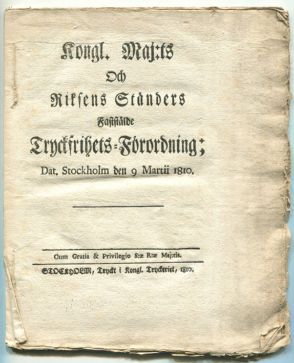 Kongl. maj:ts och riksens ständers faststälde tryckfrihets-förordning; dat. Stockholm den 9 martii 1810.