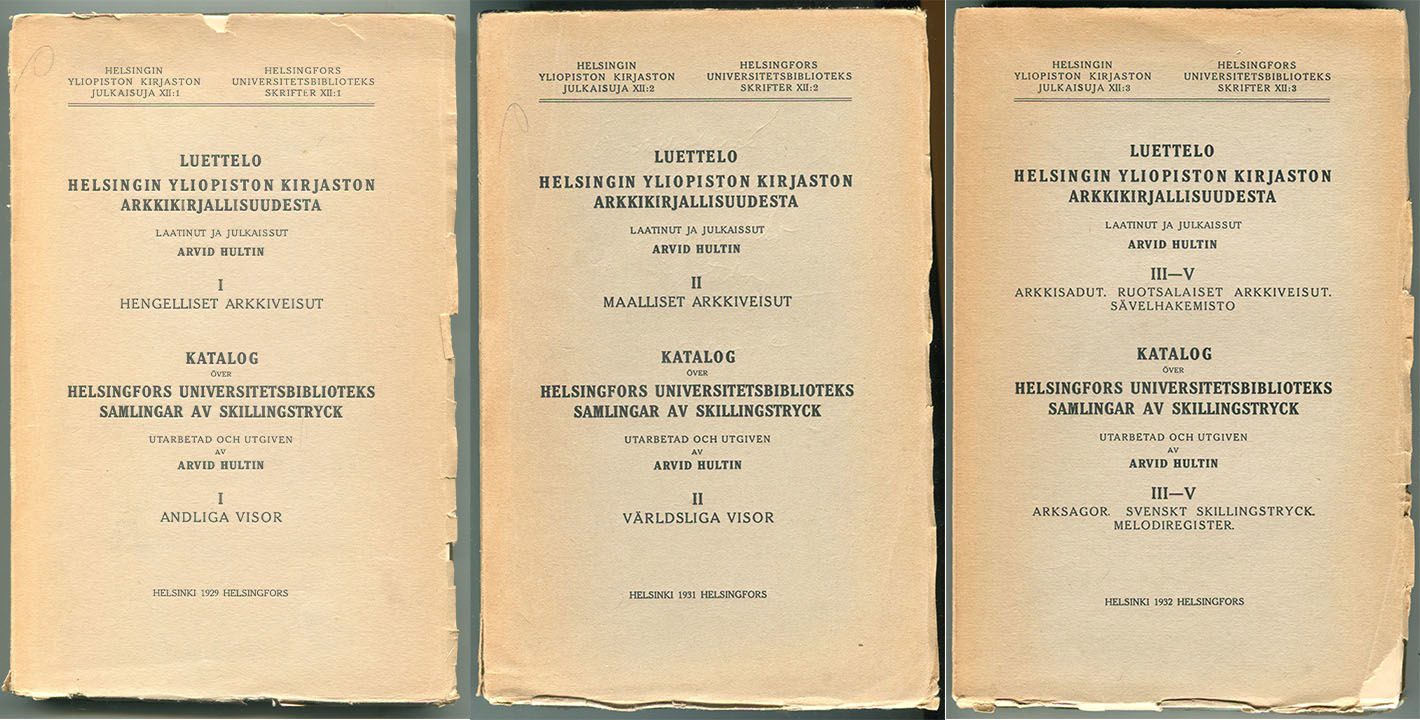 Helsingfors universitetsbiblioteks skrifter XII:1-3. Del I: Andliga visor. Del II: Världsliga visor. Del III-V (i en volym) Arksagor. Svenskt skillingtryck. Melodiregister. Hultins omfattande katalog över folkskriftssamlingen i Helsingfors universitetsbibliotek förtecknar 7500 visor, sagor och annat folkligt tillfällestryck. Arvid Hultin (1855-1935) var bibliotekarie på Helsingfors universitetsbibliotek.
