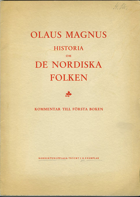 Utgiven genom Michaelisgillet MCMXLV. Korrekturupplaga tryckt i 30 exemplar. Granlunds omfattande kommentarband till den svenska översättningen av Olaus Magnus ”Historia” utkom slutligen 1951. Detta korrektur trycktes för gillets ledamöter, av vilka Hans Sallander (1903-83) var en.