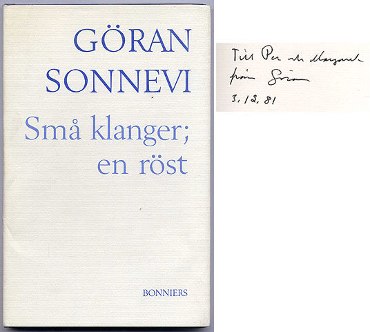 Stockholm, Bonniers grafiska industrier, 1981. 59,(2) s. Oklbd med skyddsomslag. Dedikation till ”Per [Wästberg] och Margareta från Göran. 3.12.81”.