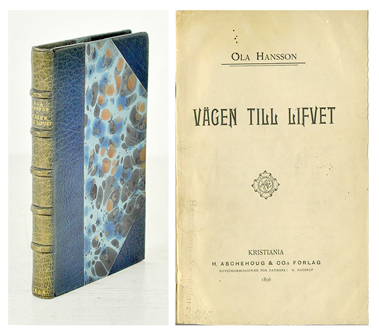 Kristiania, Aktie bogtrykkeriet, 1896. (2),175 s. Mörkblått halvmarokängbd med upphöjda bind, blindlinjerad rygg och titeltryck i guld (Bonniers bokbinderi). Snitten putsade och det främre omslaget medbundet. Ryggen blekt mot grönt. Omslaget något solkigt, med små bläckstänk, en fuktfläck och ett papperslagat hörn samt ”Rezensions-Exemplar” stämplat i bleklila. Inlagans övre ytterhörn med några pappersveck på de inledande och avslutande sidorna. Ur Gerard Bonniers bibliotek.