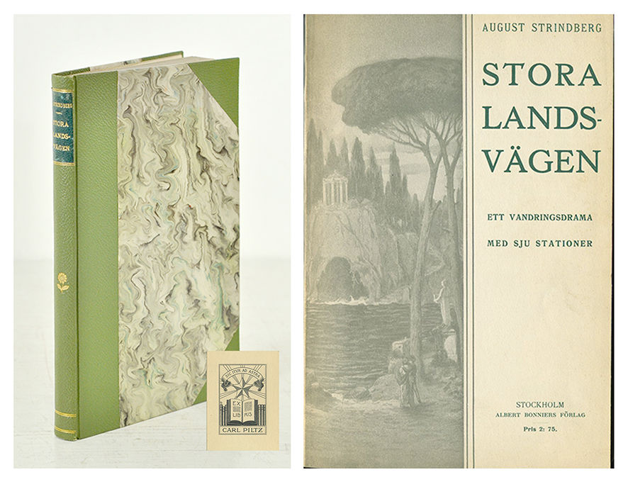 Zetterlund I:116. Strindbergs sista drama och hans litterära bokslut, sålde vid utgivningen mer än något nyutgivet drama av honom tidigare gjort. Något som säger mer om den popularitet han mot slutet av sitt liv åtnjöt än om pjäsens inneboende kvaliteter. I stycket summeras i symbolisk form de lidanden och oförrätter författaren gått igenom, och de brott han gjort sig skyldig till och blivit utsatt för. Dramat varvar högstämda lyriska passager med dialogsekvenser, i vilka en rad av Strindbergs favorithatobjekt får schavottera i grovt karikerad skepnad. Här kan man ana såväl Heidenstam och Ellen Key som Sven Hedin och den nyligen avlidne Gustaf af Geijerstam. Man bör dock vara försiktig med att alltför entydigt koppla rollkaraktärerna till verkliga förebilder, till exempel har Gunnar Brandell visat och understrukit att det ”i sista hand” inte gäller individerna utan ”mentaliteten”. Carl Axel Piltz (1881-1919) var apotekare i Stockholm och framstående konstsamlare. Hans far ägde apoteket Nordstjernan som även drev en mineralvattenfabrik och ett läkemedelsbolag. 1914 kom Piltz på obestånd och stora delar av hans konst- och boksamlingar skingrades. Andra delar såldes efter hans död. Piltz exlibris formgavs av Arthur Sjögren 1905.