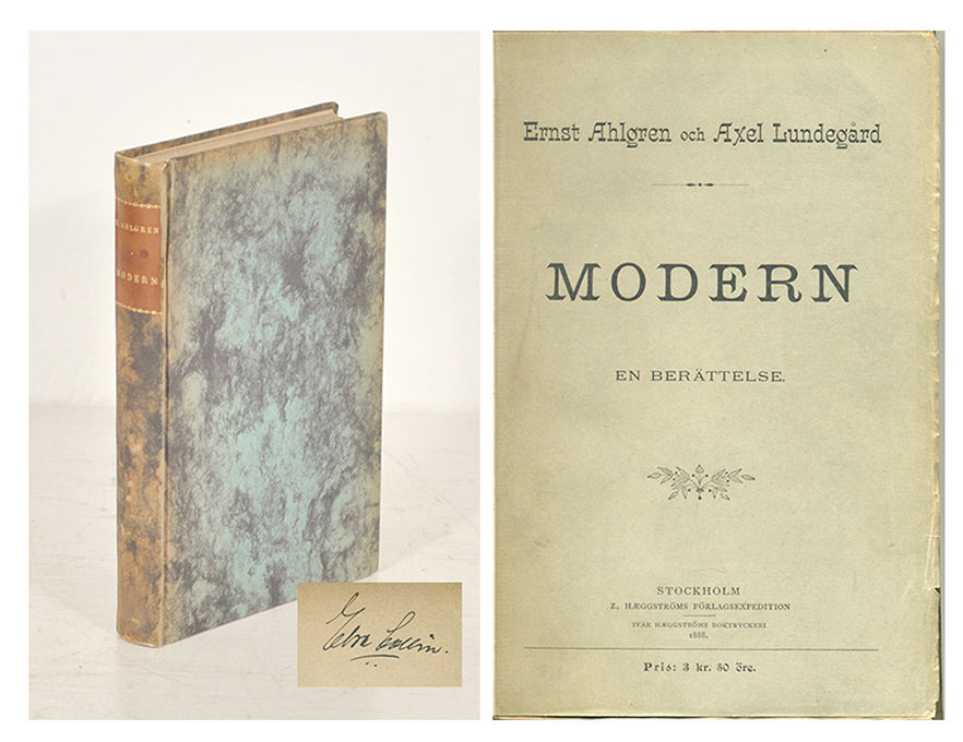 Stockholm, Ivar Hæggströms boktryckeri, 1888. 292 s. Marmorerat pappbd med brun titeletikett i skinn (Bonniers bokbinderi). Med övre putsade snitt, de övriga med råkant. Omslaget medbundet. Ryggen lite blekt och med några ljusa fläckar samt den övre ryggänden med en mindre stötskada. Titeletiketten lite flammig och med en fläck. Den främre pärmen med en svag ljusrand upptill. Omslaget lite småsolkigt och det främre med mindre riss. Inlagan något bruntonad i yttermarginalerna och sidorna 1-29 med en minimal fuktrand i den övre marginalen. Titelbladet med Elsa Collins namnteckning i svart bläck. Bra ex.