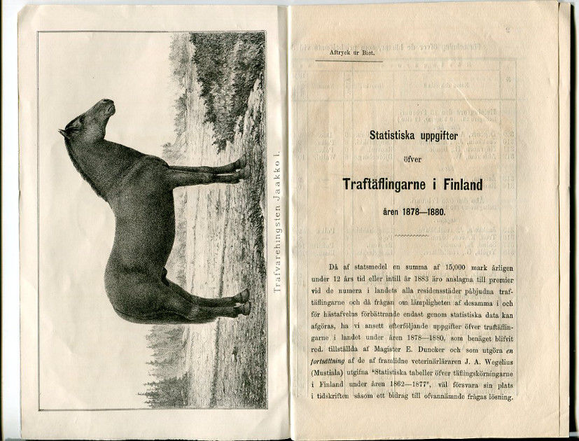 Helsingfors, A. A. Lindfors’ tryckeri, 1880. 8:o. Litograferad front,20 s. + Förteckning öfver de hästar, som prisbelönats vid de allmänna täflingskörningarne i Finland år 1881. (Aftryck från Biet.) [=rubrik]. Helsingfors, Nya aktietryckeriet, 1882. 8:o. 8 s. Häftad i gemensamt ljusblått samtida omslag med handskriven titeltext. Några småfläckar på bakre omslaget. Med Örebro läns kongl. hushållningssällskaps blå stpl och exlibris.