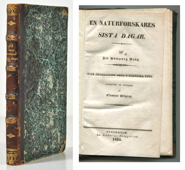 Originalets titel är ”Consolations in travel, or the last days of a philosopher” och utkom första gången 1830. De tre sista preliminärbladen med bokhandelsreklam för Schlegels ”Lifvets philosophi”, bestående av ett utdrag ur P. D. A. Atterboms förord. Kemisten Humphry Davy (1778-1829) är berömd bland annat för upptäckten av kalium, kalcium, natrium och barium.