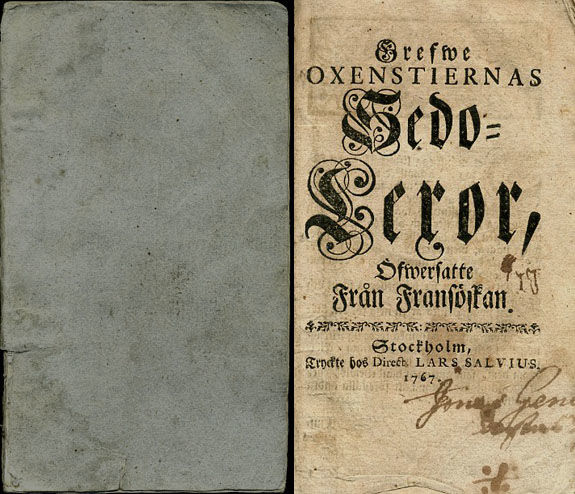 Sthlm, L. Salvius, 1767. 8:o. 88 s. Samtida hårt nött gråpappomslag med trasig rygg. Ngt nött inlaga med mindre fuktränder. Titelbladet med gammal kladdig namnteckning. Översta blanka marginalen och pagineringen på s. 7-8 bortskuren.