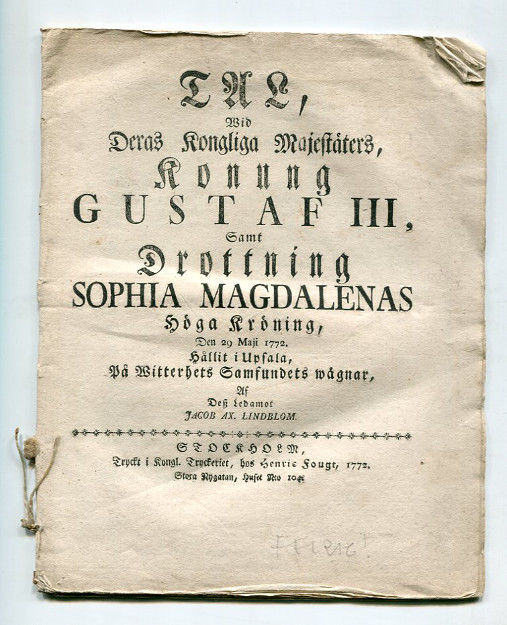 Tal, wid deras kongliga majestäters, konung Gustaf III, samt drottning Sophia Magdalenas höga kröning, den 29 maji 1772 hållit i Upsala, på Witterhets samfundets wägnar, af dess ledamot.