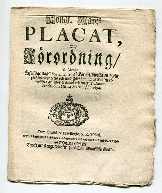 Kongl. may:tz placat, och förordning/ angående åtskillige slags sortementer af lärefft/ hwilka en deels förbiudes/ endeels och med förhöyning af tullen efterlåtes at införskrifwas och införas. Datum Stockholm den 14 martii, åhr 1694.