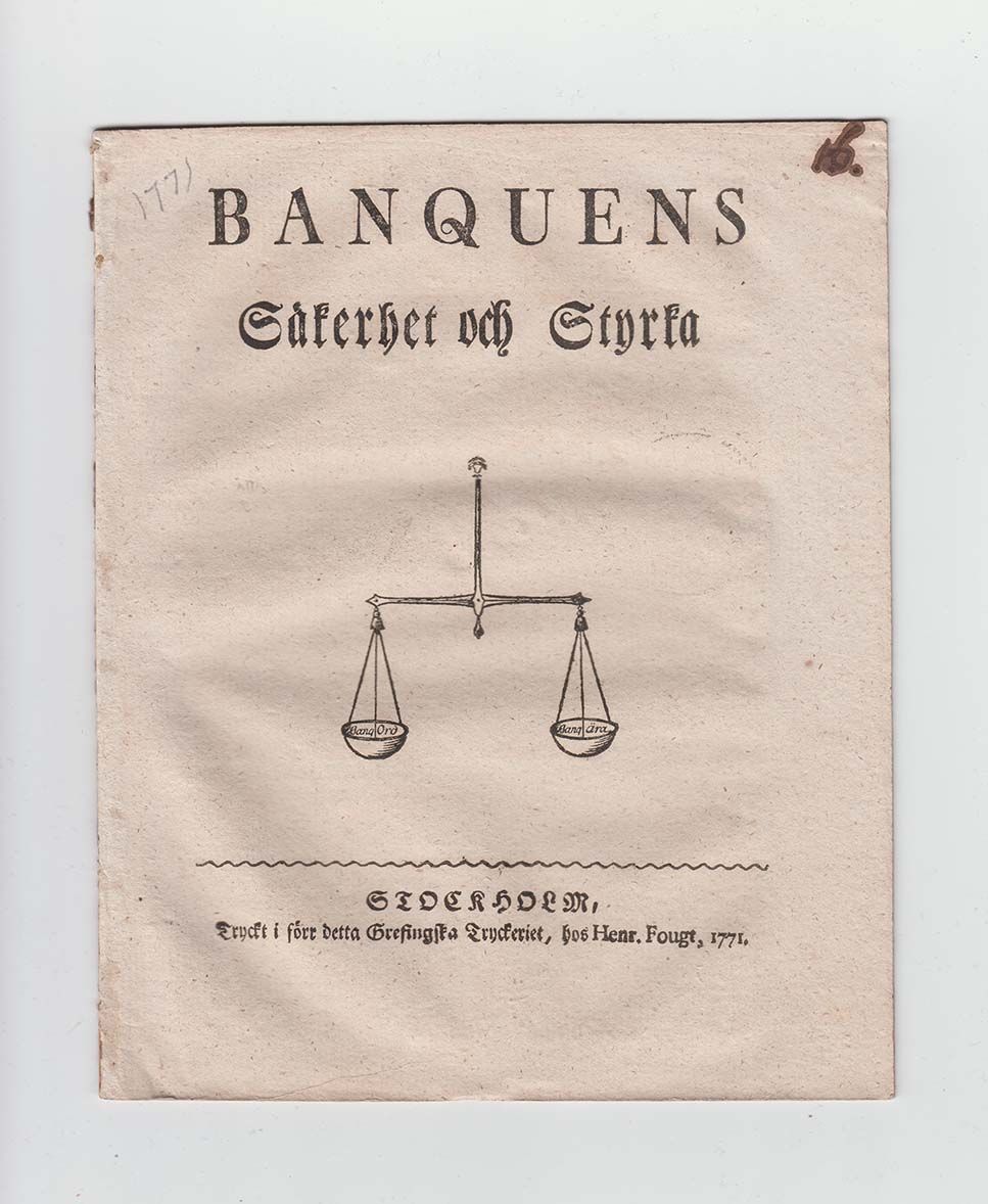 Vågen med ”Banq ord” respektive ”Banq ära” tryckt i skålarna. Jämför Riksbankens valspråk ”Hinc robur et securitas” - härav styrka och säkerhet. Ett under 1700-talet omåttligt populärt ämne som avhandlas i denna av många broschyrer, nämligen ”wäxel-coursens styrande, banco-sedlars och penninge-wärdets stadgande, eller realisation, näringarnes derpå beroende hjelp eller förfall”. Den anonyma författaren dristar sig dock, trots ämnets minst sagt omtvistade art, ”at för den owälduga allmänheten än ytterligare framställa mine enfaldiga tankar om några hufwudsakeliga delar af en så widlöftig sak”. Dock lämnar han en brasklapp, nämligen att han avsäger sig ”alt penne-krig med egennyttiga winglare”. Skriften utgör ett exempel på vad Eli Heckscher menar var de bildade klassernas under 1700-talet ”nästan feberaktiga intresse för de ekonomiska frågorna och den nästan tropiska växtlighet som den ekonomiska litteraturen särskilt i broschyrform fick, närmast under frihetstiden”.