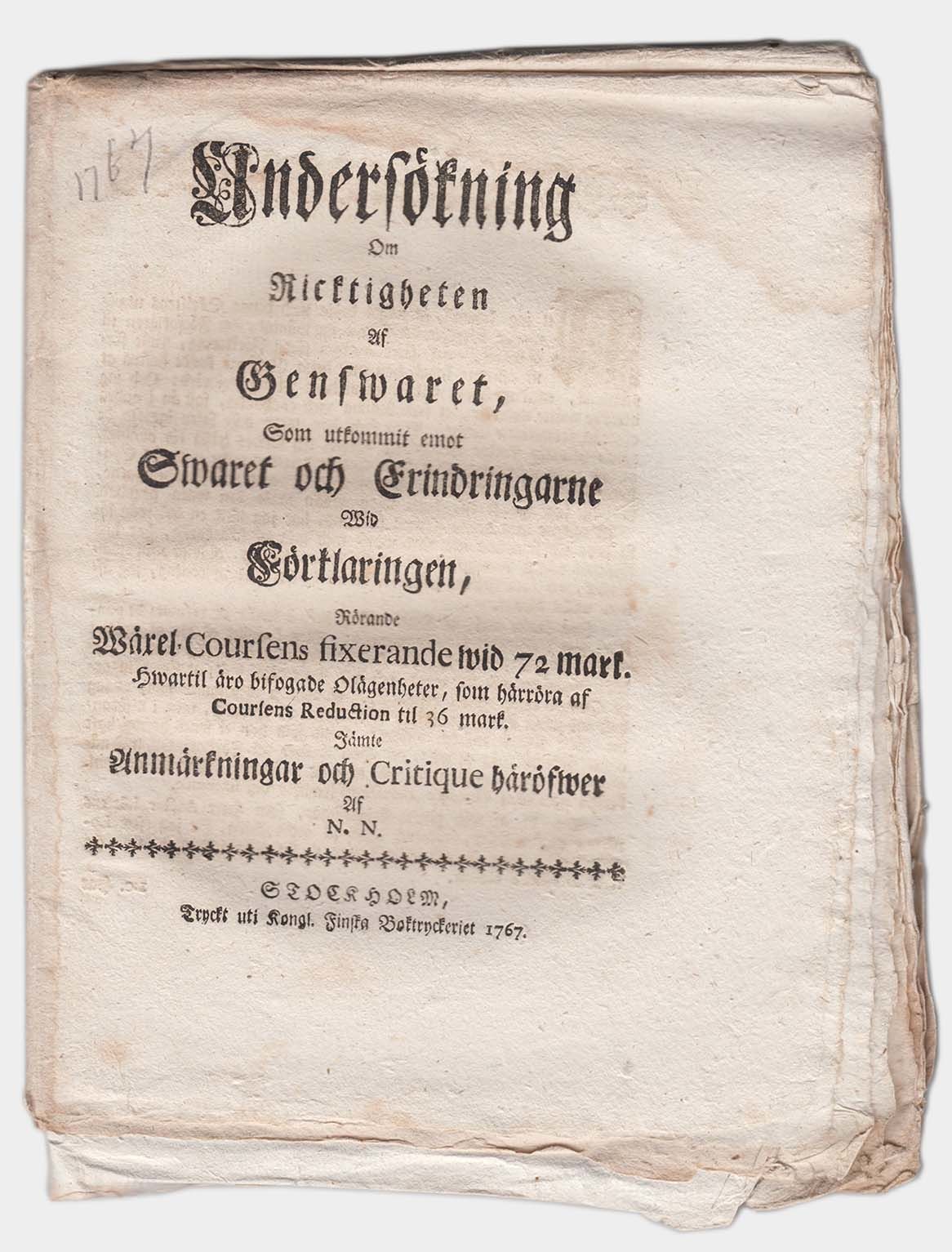 Undersökning om ricktigheten af genswaret, som utkommit emot swaret och erindringarne wid förklaringen, rörande wäxel-coursens fixerande wid 72 mark. Hwartil äro bifogade olägenheter, som härröra af coursens reduction til 36 mark. Jämte anmärkningar och critique häröfwer af N. N.