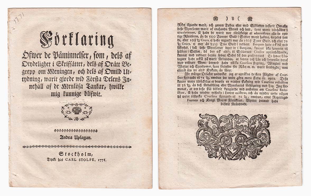 Sthlm, C. Stolpe, 1771. 4:o. 8 s. Tagen ur band. Några svaga fläckar i yttermarginalen. Från Stafsund.