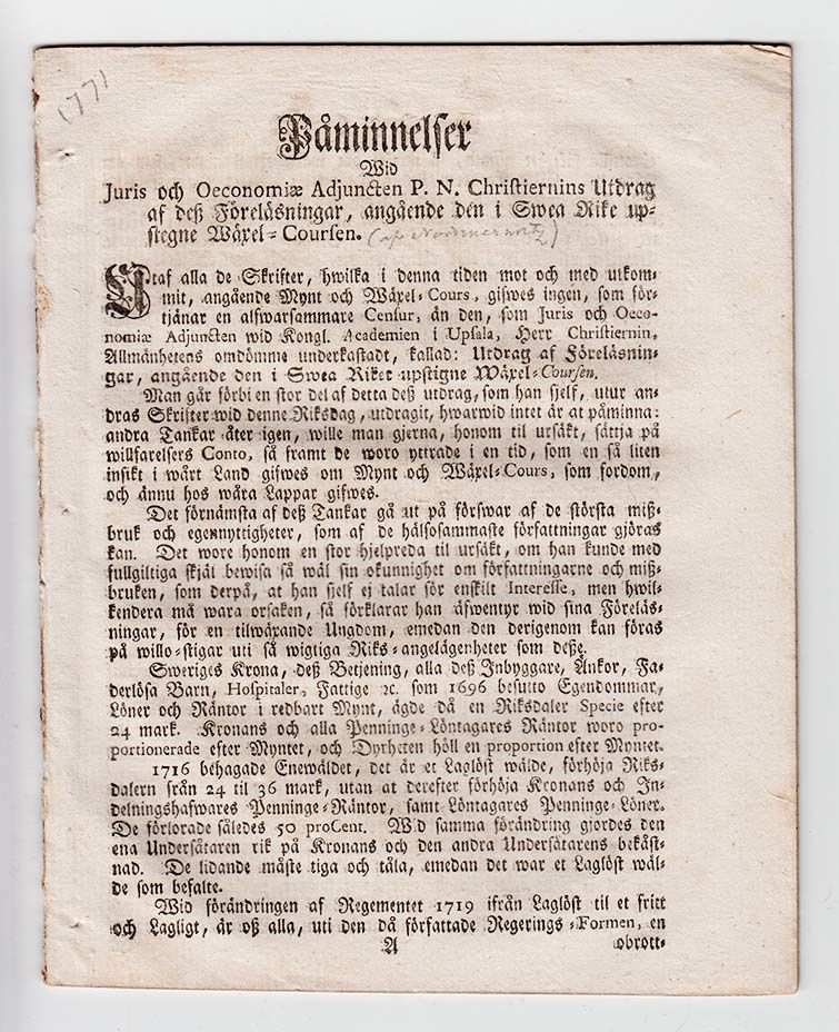 Påminnelser wid juris och oeconomiæ adjuncten P. N. Christiernins utdrag af dess föreläsningar, angående den i Swea rike upstegne wäxel-coursen. [=rubrik].