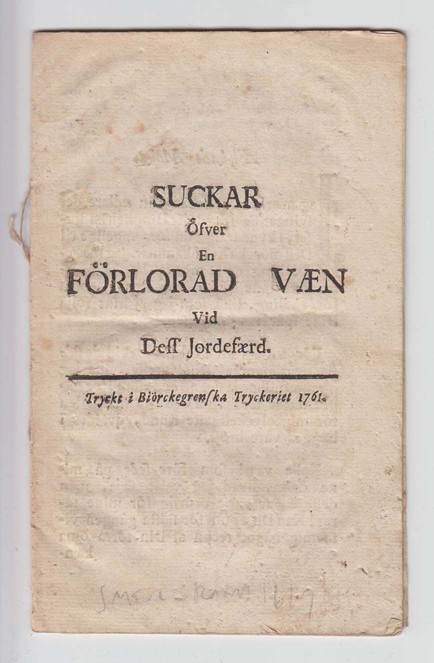 (Linköping), Biörckegrenska tryckeriet, 1761. 8:o. (19) s. Häftad. Sista två bladen nästan helt loss. Sista bladet med litet nagg i yttermarginalen och några smårevor i texten. Ställvis småfläckig.