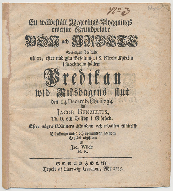 En wälbestält regerings-byggnings twenne grundpelare bön och arbete korteligen förestälte uti en, efter nådigsta befalning, i S. Nicolai kyrckia i Stockholm hållen predikan wid riksdagens slut den 14 decemb. åhr 1734 [...]. Efter några wänners åstundan och erhållen tillåtelse til allmän nytta och upmuntran igenom trycket utgifwen af Jac. Wilde.