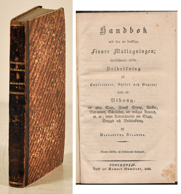 Handbok wid den nu brukliga finare matlagningen; innehållande tillika beskrifning på confecturer, sylter och glacer; samt ett bihang, att göra soja, fransk senap, ättickor, bär-winer, bär-safter, att inlägga anjovis, m.m.; jemte några underrättelser om slagt, brygd och brödbakning. Af Margaretha Nylander. Nionde tillökta och förbättrade upplagan.