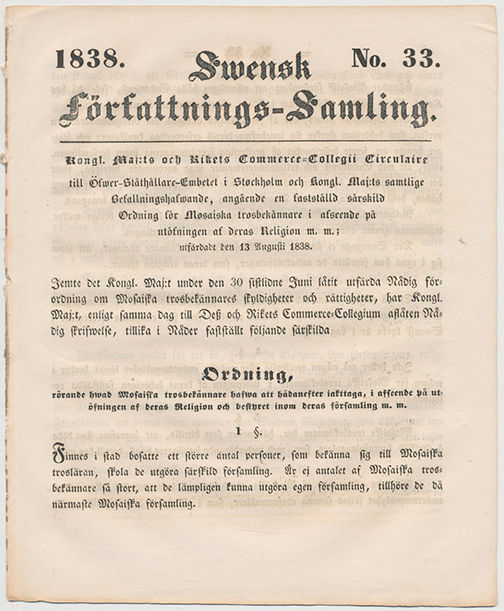 Swensk författnings-samling. 1838. No. 33. Utgavs den 29 augusti 1838. Var en följd av förordningen från den 30 juni 1838 ”angående mosaiske trosbekännares skyldigheter och rättigheter här i riket”.