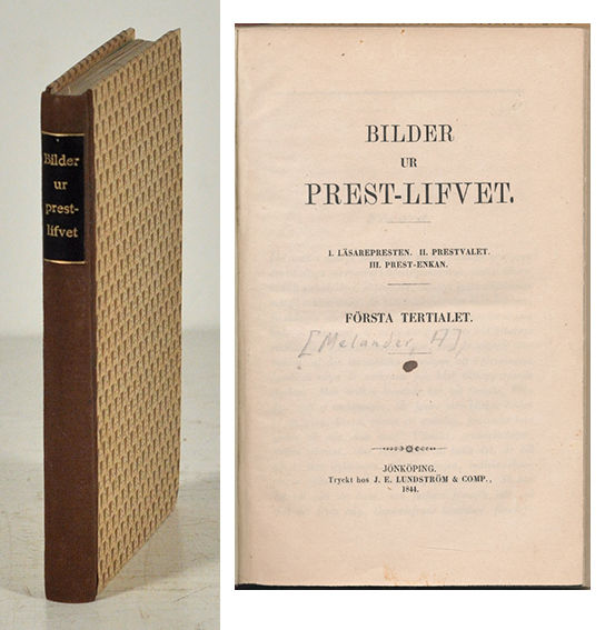 Jönköping, J. E. Lundström & comp., 1844. 8:o. (4),63 s. + (MELANDER, ANDERS) Bilder ur prest-lifvet. I. Prosthuset. II. Land-capellanen. III. Cellfängelset. Andra tertialet. Växjö, H. S. Cederschiöld, 1855. 8:o. 88 s. + (MELANDER, ANDERS) Bilder ur prest-lifvet. I. Magdalena. II. Missionsresan. III. Hospitalet. Tredje tertialet. Sthlm, A. L. Norman, 1858. 8:o. 79 s. Mörkbrunt hklbd från 1900-talets andra hälft med svart titeletikett. En liten handskriven etikett på insidan av främre pärmen. Främre omslaget till andra tertialet och hela omslaget till det tredje medbundna. Med C. Fr. Petterssons namnteckning. Ur Hjalmar Gustafssons bibliotek.