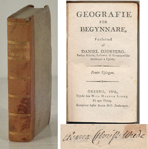 Örebro, N. M. Lindh, 1805. 12:o. (8),388 s. + DJURBERG, DANIEL. Ändringar och förbättringar til femte uplagan af Geografie för begynnare. Örebro, N. M. Lindh, 1810. 12:o. (2),389-481 s. Samtida ljusbrunt hfrbd med guldlinjerad rygg och titeletikett. Blekta gula snitt. Ryggen är nött och torr samt med fläckar i nedre delen och en liten skada i rygghuvudet. Stötta pärmhörn. Några vikta hörn. Med Anna Christ. Wredes namnteckning på försättsbladet. Från Biby.