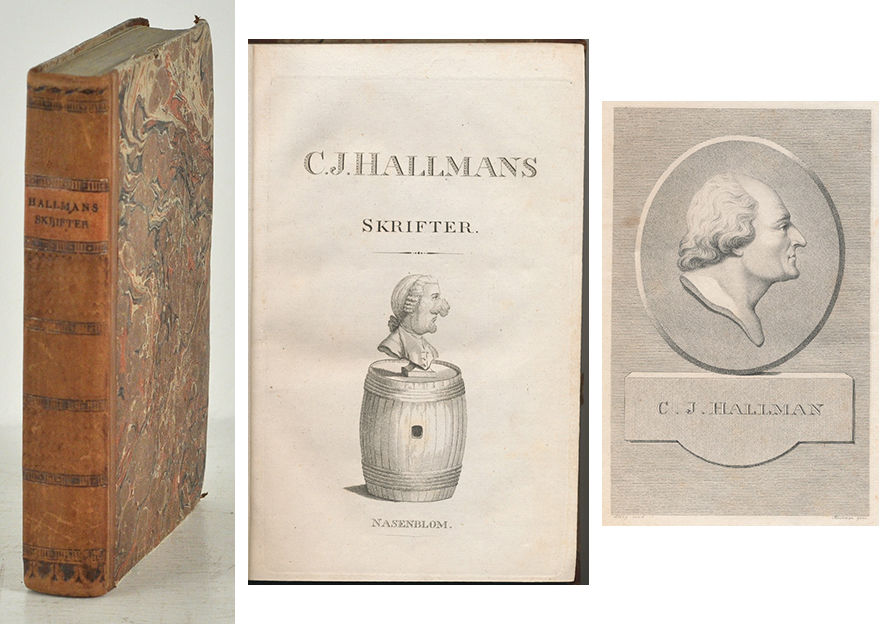 Klemming Sveriges dramatiska litteratur s. 217 med hänvisningar. Med en tryckt dedikation ställd till Par Bricole och ett företal av J. M. Stjernstolpe. Hallmans porträtt är graverat av Ruckman efter en förlaga av Åberg. Porträttet som pryder det extra graverade titelbladet föreställer Nasenblom, vars förebild ska ha varit apotekaren G. Hahr på Kungsholmen. Som vanligt saknas den sällsynta planschen som föreställer ”Bakelse-Jeanna”, en av figurerna i ”Donnerpamp”. Tryckningen påbörjades 1819, då en separatupplaga ur dessa ”Skrifter” av ”Tillfället gör tjufven” utkom. Arbetet innehåller större delen av författarens dramatiska produktion.