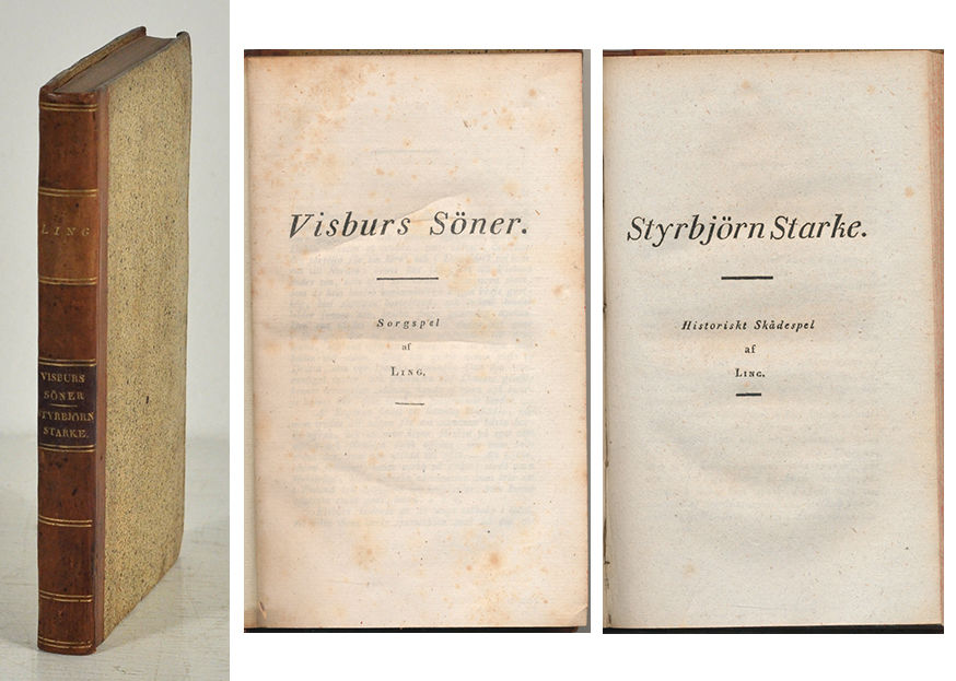 Sthlm, B. Nestius, 1824. (6),132,(2) s. + LING, (PER HENRIK). Styrbjörn Starke. Historiskt skådespel. Sthlm, G. Scheutz, 1824. (6),132,(12) s. Samtida trevligt hfrbd med guldlinjerad rygg, dubbla titeletiketter, den ena ljusbrun, den andra mörkbrun. Rödstänkta snitt. Något lagerfläckig, t.ex. i början och på s. 81-100 i första arbetet och bladet s. 15-16 med lång reva. Med F. Engquists namnteckning i blyerts daterad 1906. Lings kontrollstplr på sista sidorna.