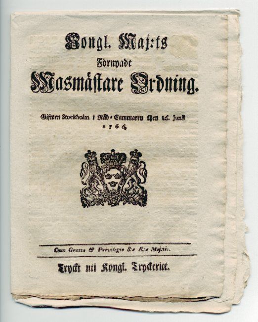 Kongl. maj:ts förnyade masmästare ordning. Gifwen Stockholm i råd-cammaren then 26 junii 1766.
