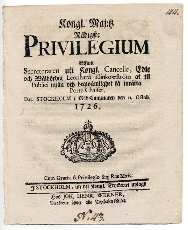 Kongl. maj:tz nådigste privilegium gifwit secreteraren uti kongl. Cancelie, edle och wälbördig Leonhard Klinkowström at til publici nytta och beqwämlighet få inrätta porte-chaiser. Dat. Stockholm i råd-cammaren den 11 octob. 1726.
