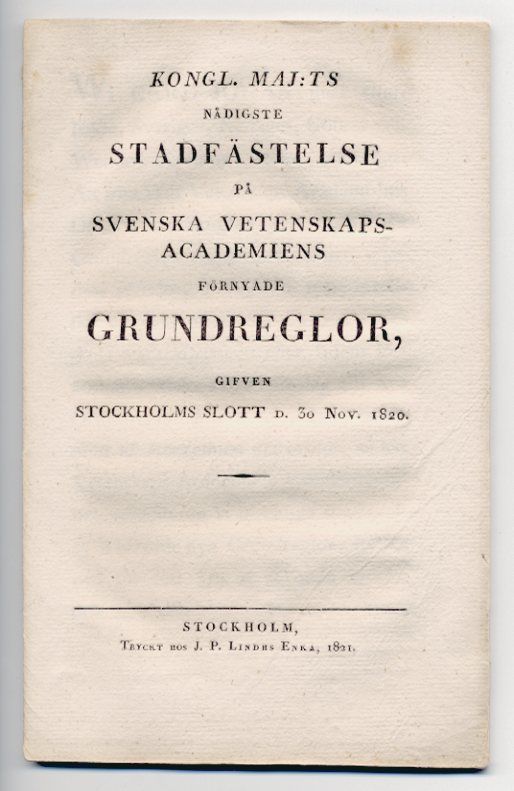 Kongl. maj:ts nådigste stadfästelse på svenska Vetenskaps-academiens förnyade grundreglor, gifven Stockholms slott d. 30 nov. 1820.