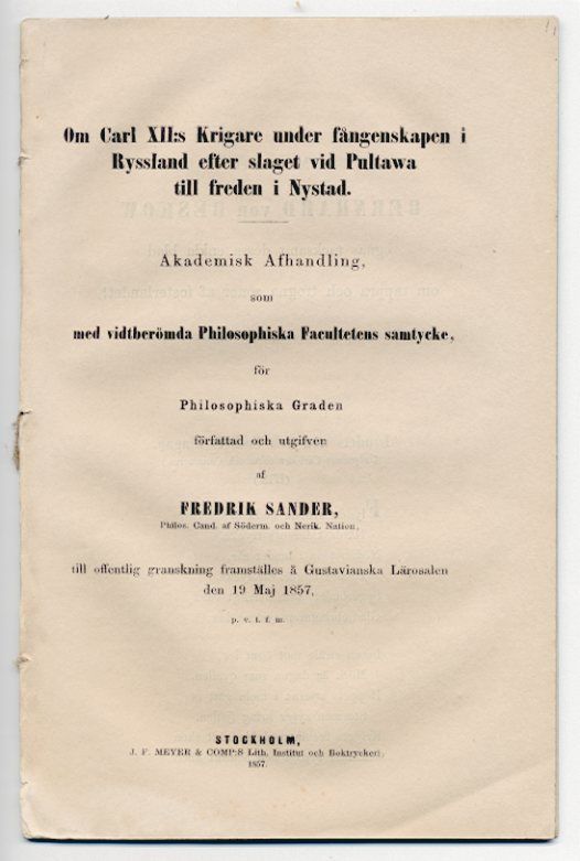 Setterwall Svensk historisk bibliografi 2895. Josephson Avhandlingar ock program s. 199. Avhandling vid Uppsala universitet. Med en inledande dikt ”Landets nöd och folkets klagan. (Ur poemet Carl den tolfte och carolinerna. (1713.)”. Fredrik Sander (1828-1900) var chef för Nationalmuseum och hans diktverk ”Den fallande stjernan” belönades med Svenska akademiens stora pris 1853.