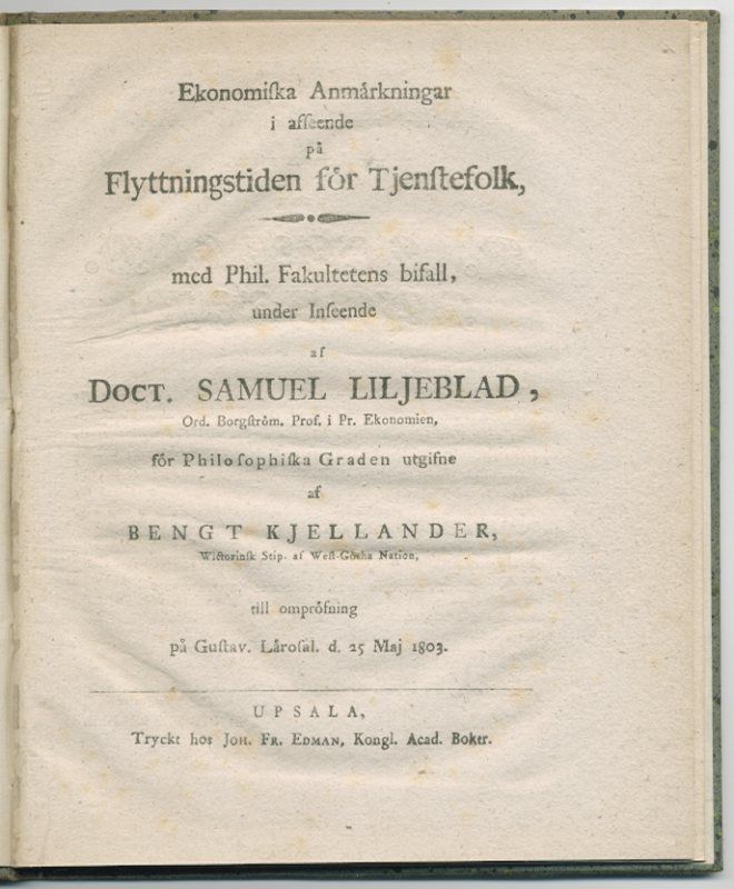 Marklin Catalogus disputationum 3. Hebbe Den svenska lantbrukslitteraturen 2663. Utgavs även som ett av de tre häftena i serien ”Akademiska afhandlingar i landt-hushållningen” (Hebbe 48). Med en tryckt dedikation till P. Alexand. Rudbeck. På svenska, men sista sidan med sex ”Theses” på latin. I avhandlingen diskuteras tjänstefolks kontraktstid och vilken tidpunkt på året som vore bäst för kontraktets upphörande och möjlig flyttning.