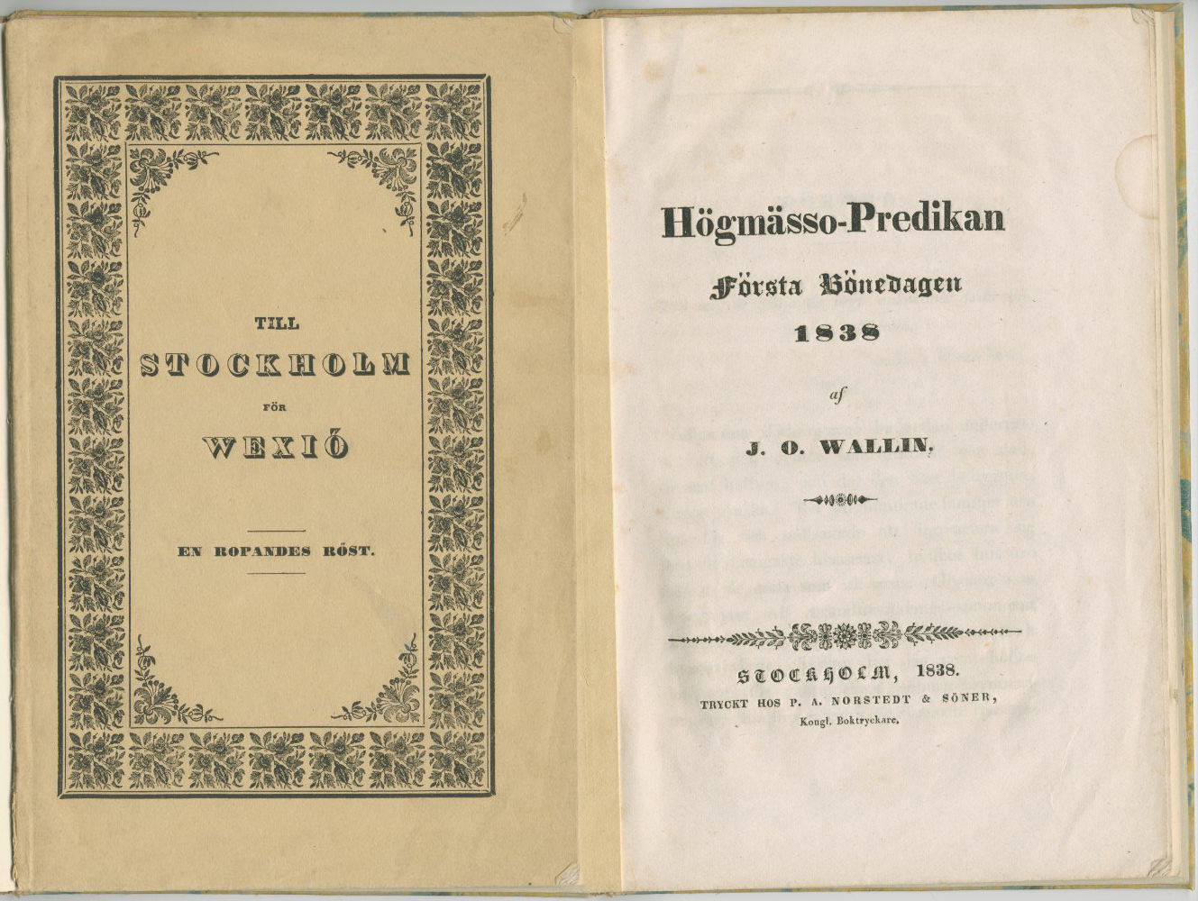 Det främre omslaget har texten ”Till Stockholm för Wexiö. En ropandes röst” och det bakre ”Säljes för Wexiö”. Dessutom noteras på sista sidan att Norstedts kostnadsfritt har tryckt skriften. I förordet återfinns ett avtryckt brev från biskopen i Växjö, Esaias Tegnér, med en bön om bistånd efter en brand som ödelagt stora delar av staden. Detta i kombination med en tidigare missväxt har gjort att ”staden varit nödsakad att anlita den allmänna välgörenheten”.