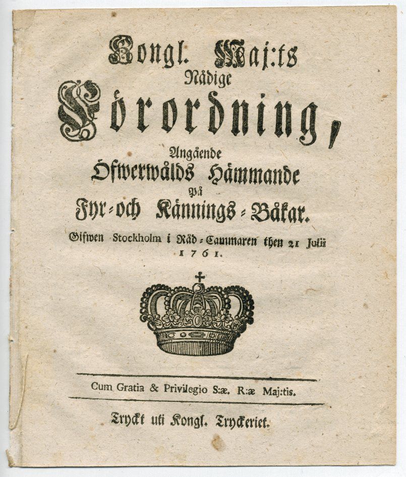 Kongl. maj:ts nådige förordning, angående öfwerwålds hämmande på fyr- och kännings-båkar. Gifwen Stockholm i råd-cammaren then 21 julii 1761.
