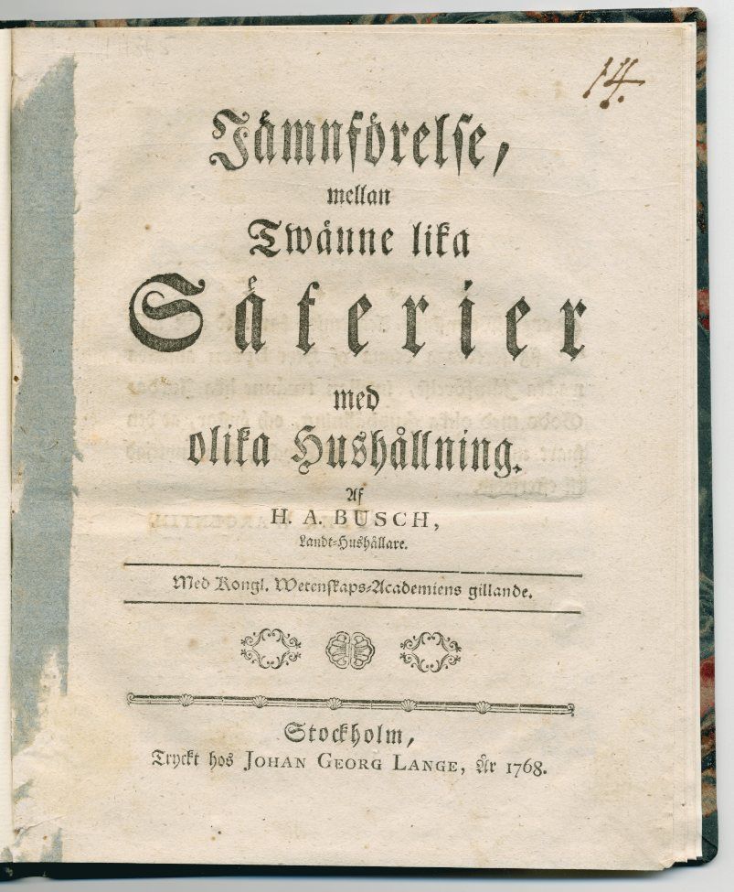 Jämnförelse, mellan twänne lika säterier med olika hushållning. Med kongl. Wetenskaps-academiens gillande.