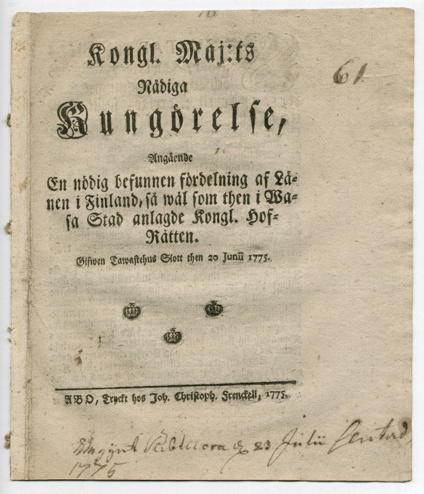 Kongl. maj:ts nådiga kungörelse, angående en nödig befunnen fördelning af länen i Finland, så wäl som then i Wasa stad anlagde kongl. hof-rätten. Gifwen Tawastehus slott then 20 junii 1775.