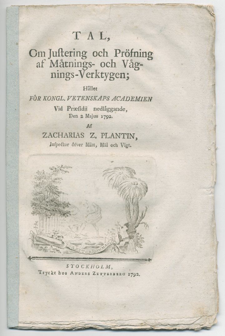 Svarstalet hölls av Vetenskapsakademiens sekreterare Johan Carl Wilcke. Zacharias Zachariasson Plantin (1727-99) var inspektor över mått, mål och vikt i Vetenskapsakademien.