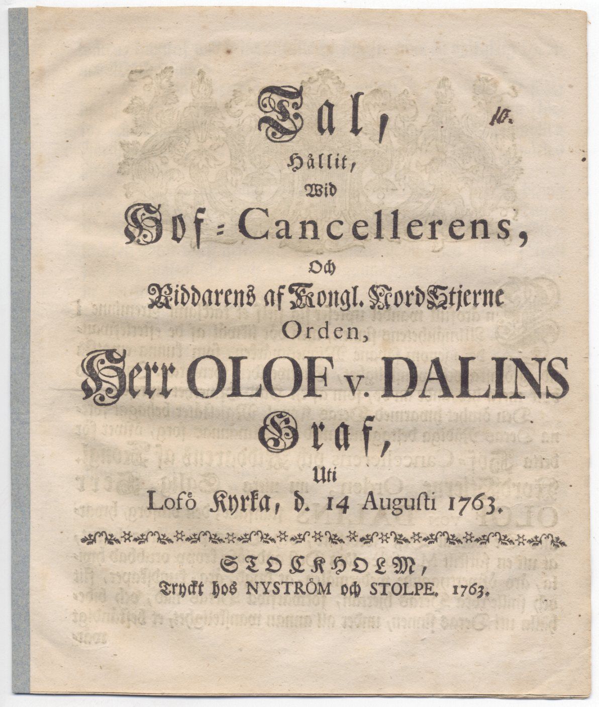Tal, hållit, wid hof-cancellerens, och riddarens af kongl. Nordstjerne orden, herr Olof v. Dalins graf, uti Lofö kyrka, d. 14 augusti 1763.
