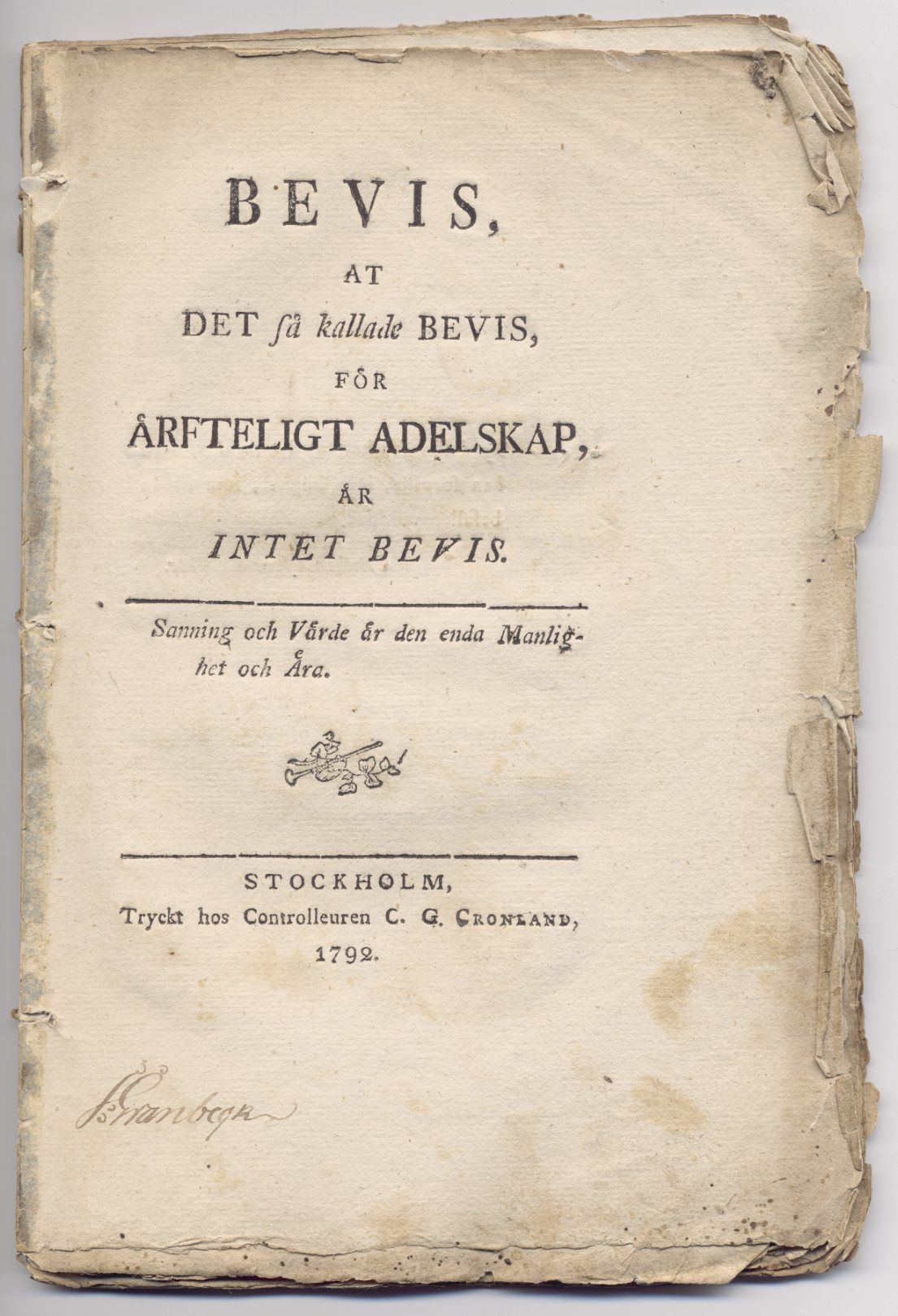 Sthlm, C. G. Cronland, 1792. 8:o. 56 s. Häftad och oskuren. Med spår av gammalt gråpapper i ryggen. Delvis loss i häftningen. Titelsidan har lite pappersförluster i innermarginalen. Något solkig, se t.ex. titelsidan och s. 4-6. Med en samtida namnteckning nederst på titelsidan, ”J. Granbegk” [?].