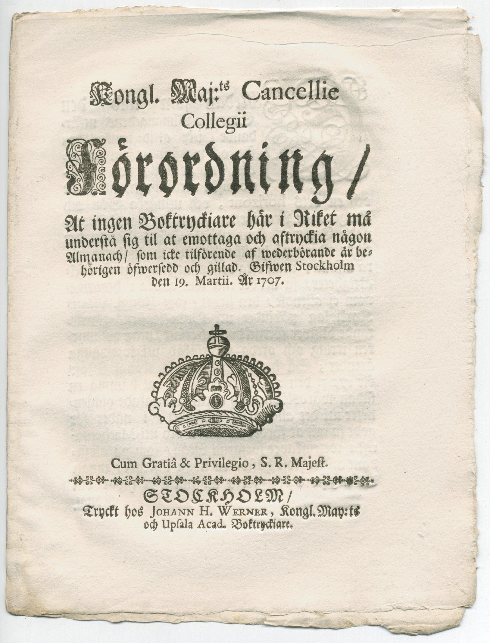 Kongl. maj:ts Cancellie collegii förordning/ at ingen boktryckiare här i riket må understå sig til at emottaga och aftryckia någon almanach/ som icke tilförende af wederbörande är behörigen öfwersedd och gillad. Gifwen Stockholm den 19 martii år 1707.