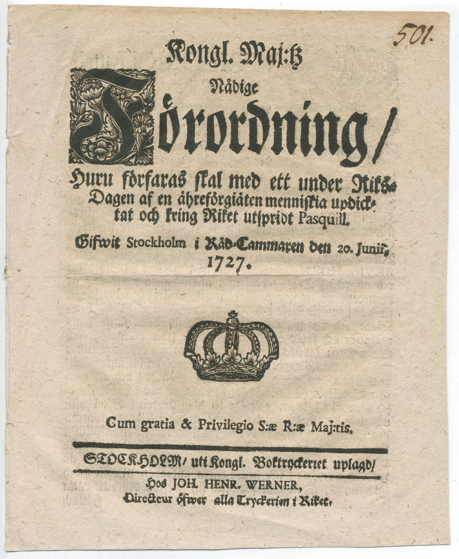 Kongl. maj:tz nådige förordning/ huru förfaras skal med ett under riks-dagen af en ähreförgiäten menniskia updicktat och kring riket utspridt pasquill. Gifwit Stockholm i råd-cammaren den 20 junii 1727.