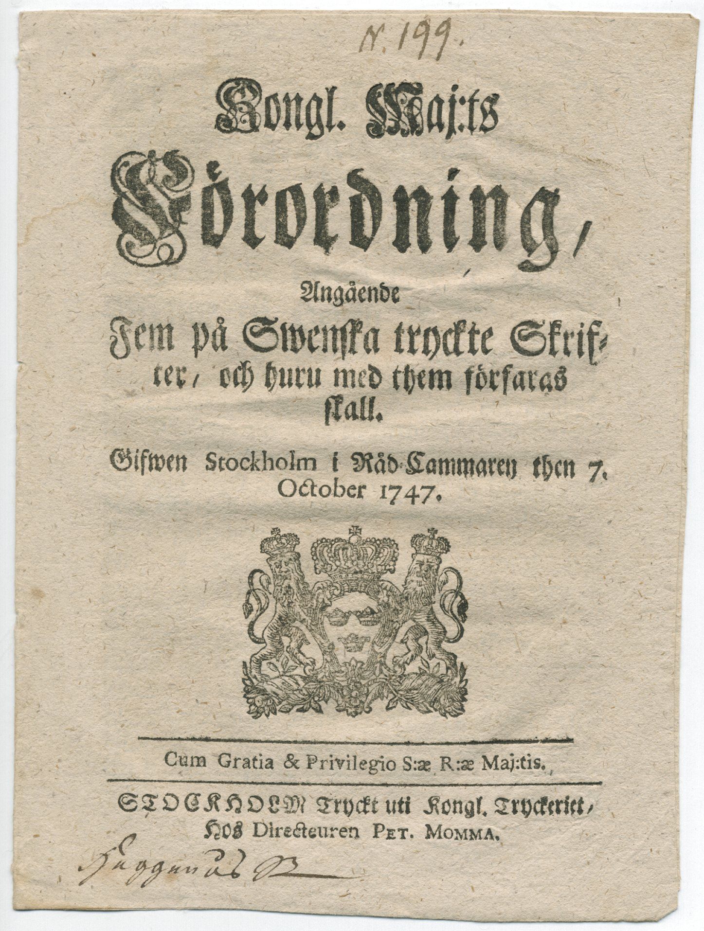 Kongl. maj:ts förordning/ angående fem på swenska tryckte skrifter, och huru med them förfaras skall. Gifwen Stockholm i råd-cammaren then 7 october 1747.