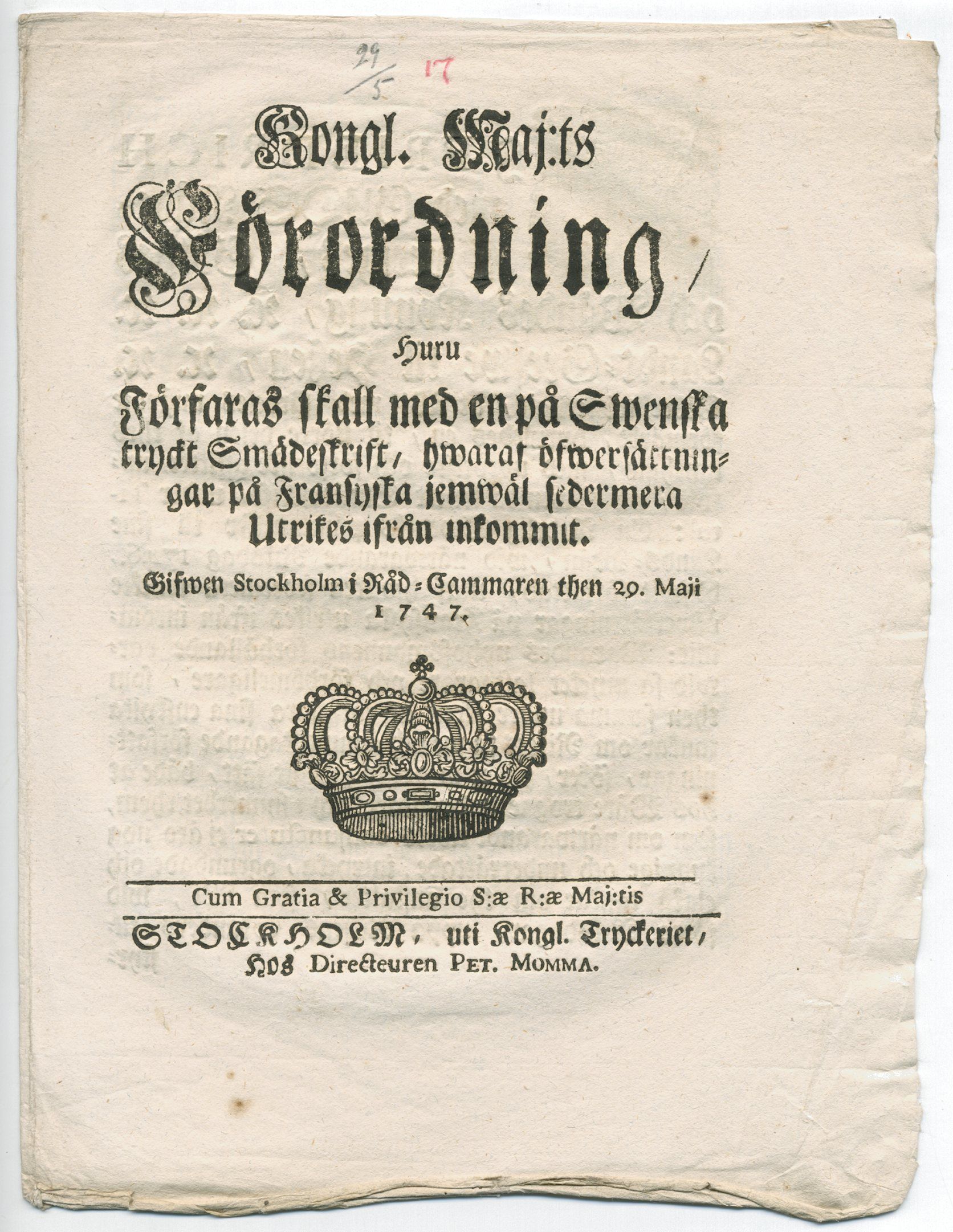 Kongl. maj:ts förordning/ huru förfaras skall med en på swenska tryckt smädeskrift, hwaraf öfwersättningar på fransyska jemwäl sedermera utrikes ifrån inkommit. Gifwen Stockholm i råd-cammaren then 29 maji 1747.