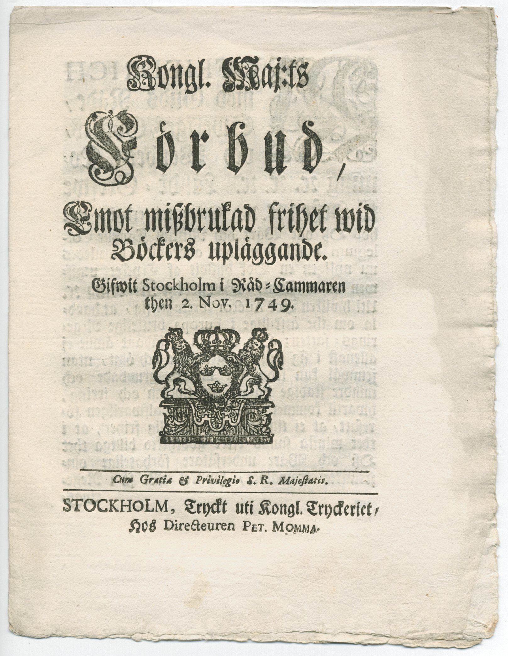 Kongl. maj:ts förbud/ emot missbrukad frihet wid böckers upläggande. Gifwit Stockholm i råd-cammaren then 2 nov. 1749.