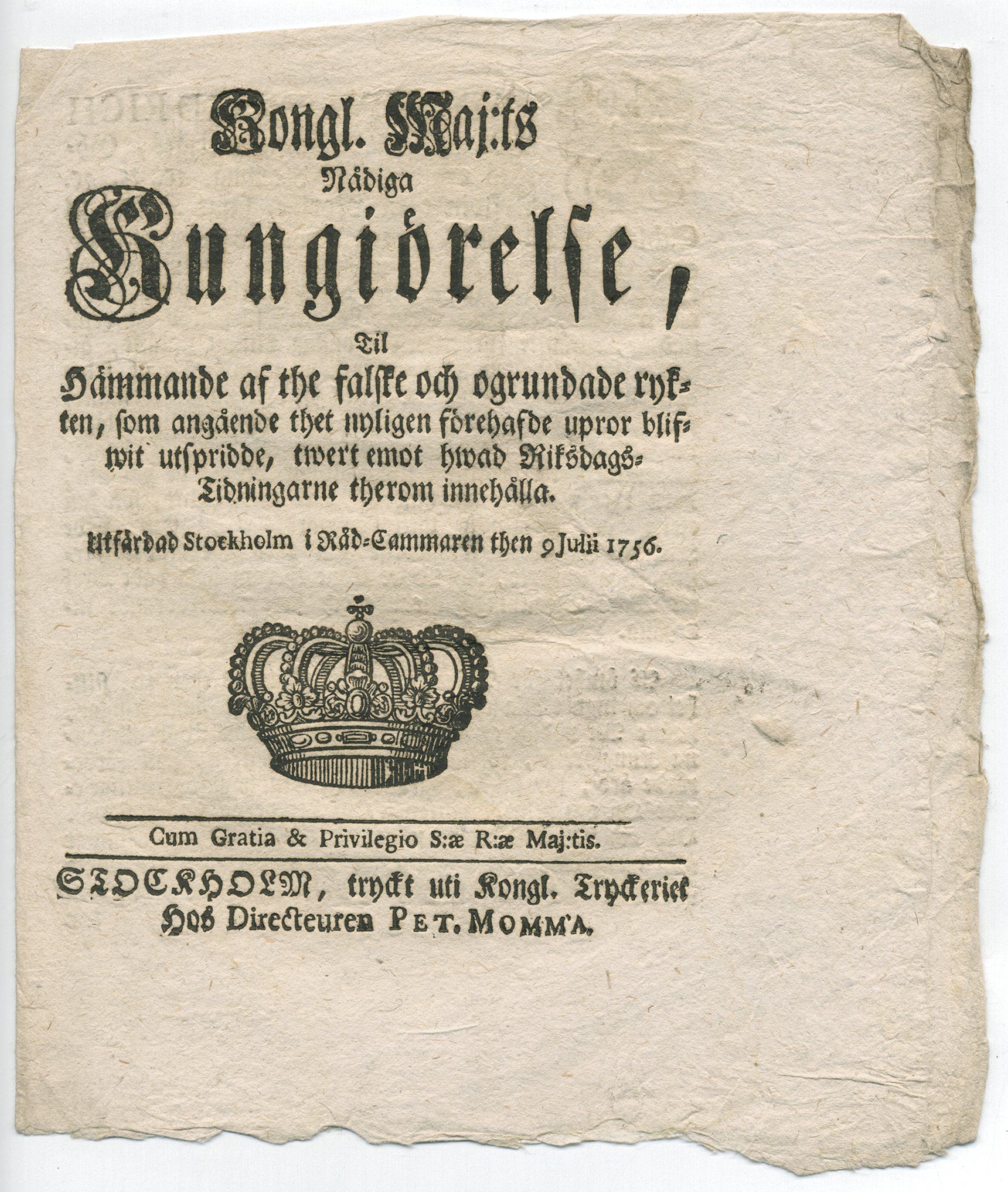 Kongl. maj:ts nådiga kungiörelse, til hämmande af the falske och ogrundade rykten, som angående thet nyligen förehafde upror blifwit utspridde, twert emot hwad riksdags-tidningarne therom innehålla. Utfärdad Stockholm i råd-cammaren then 9 julii 1756.