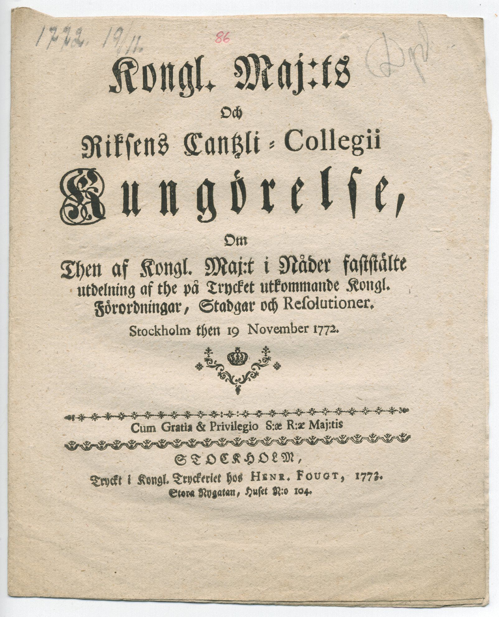 Kongl. maj:ts och riksens Cantzli-collegii kungörelse, om then af kongl. maj:t i nåder faststälte utdelning af the på trycket utkommande kongl. förordningar, stadgar och resolutioner. Stockholm then 19 november 1772.