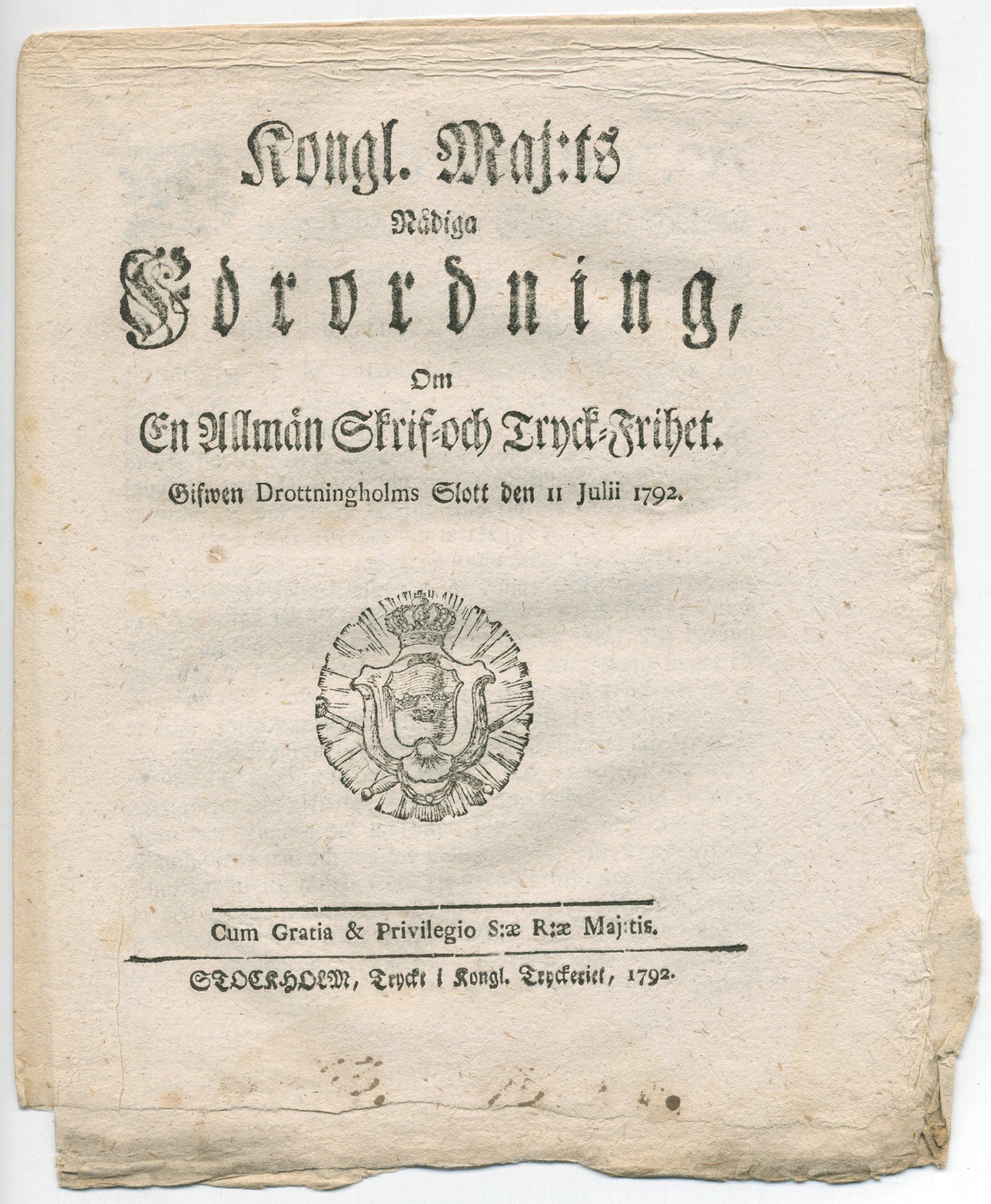 Kongl. maj:ts nådiga förordning, om en allmän skrif- och tryck-frihet. Gifwen Drottningholms slott den 11 julii 1792.