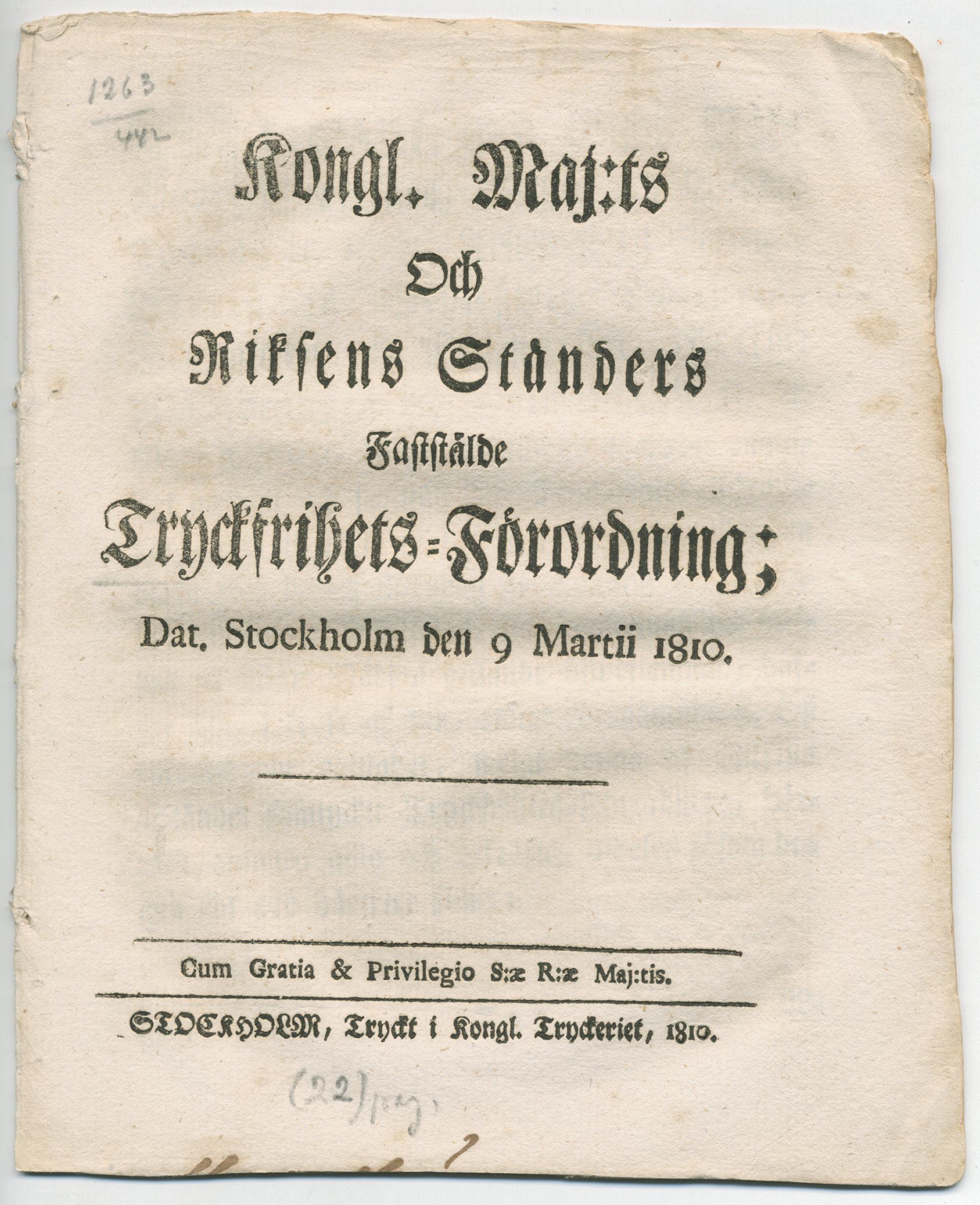 Kongl. maj:ts och riksens ständers faststälde tryckfrihets-förordning; dat. Stockholm den 9 martii 1810.