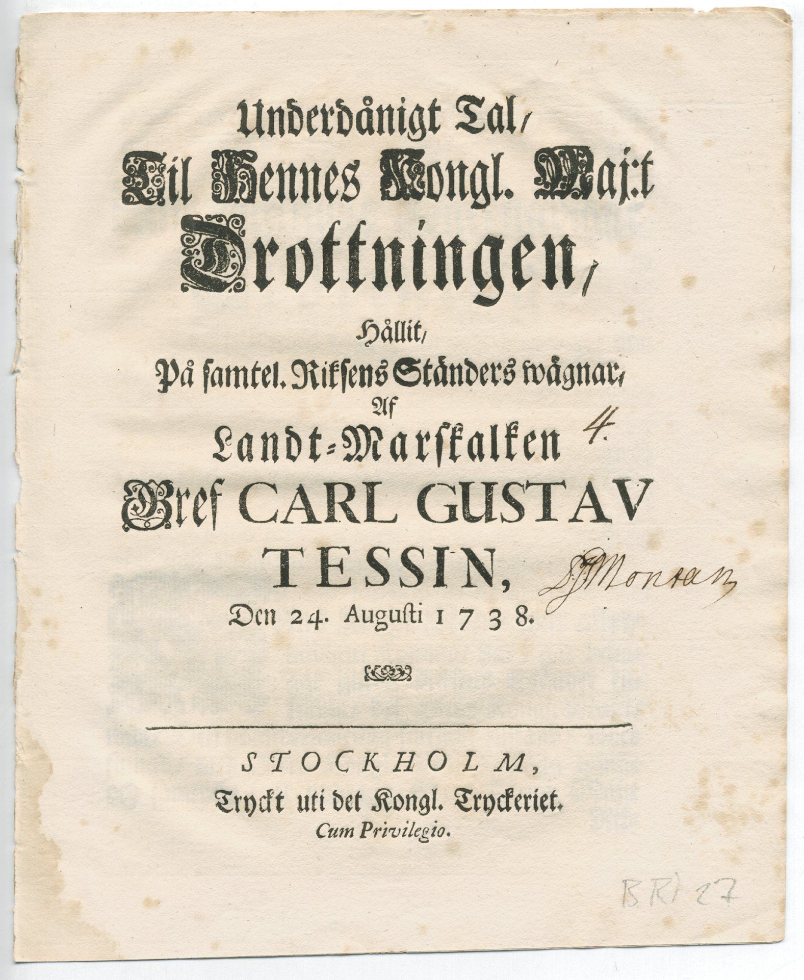 Underdånigt tal/ til hennes kongl. maj:t drottningen/ hållit/ på samtel. riksens ständers wägnar/ af landt-marskalken gref Carl Gustav Tessin, den 24 augusti 1738.