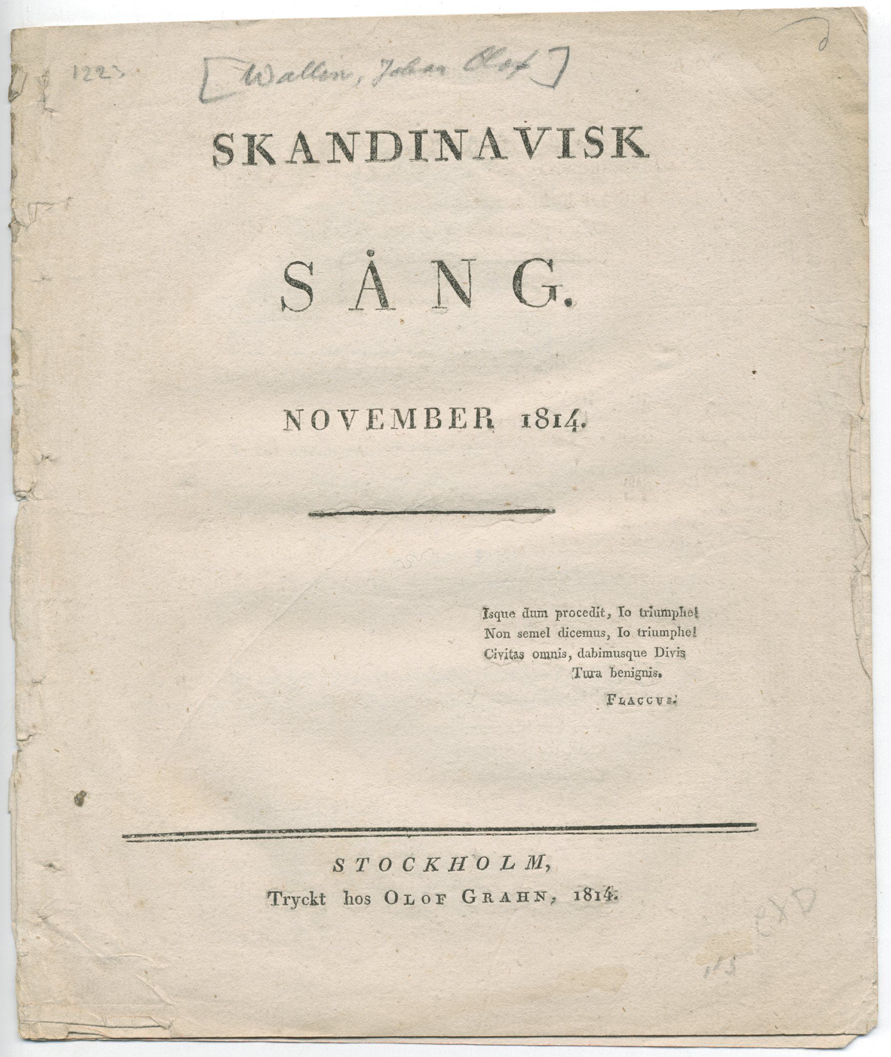 Sthlm, O. Grahn, 1814. 4:o. (8) s. Tagen ur band. Titelbladet och sista sidan lätt solkiga. Smårevor i ryggen och sista bladet nästan loss.