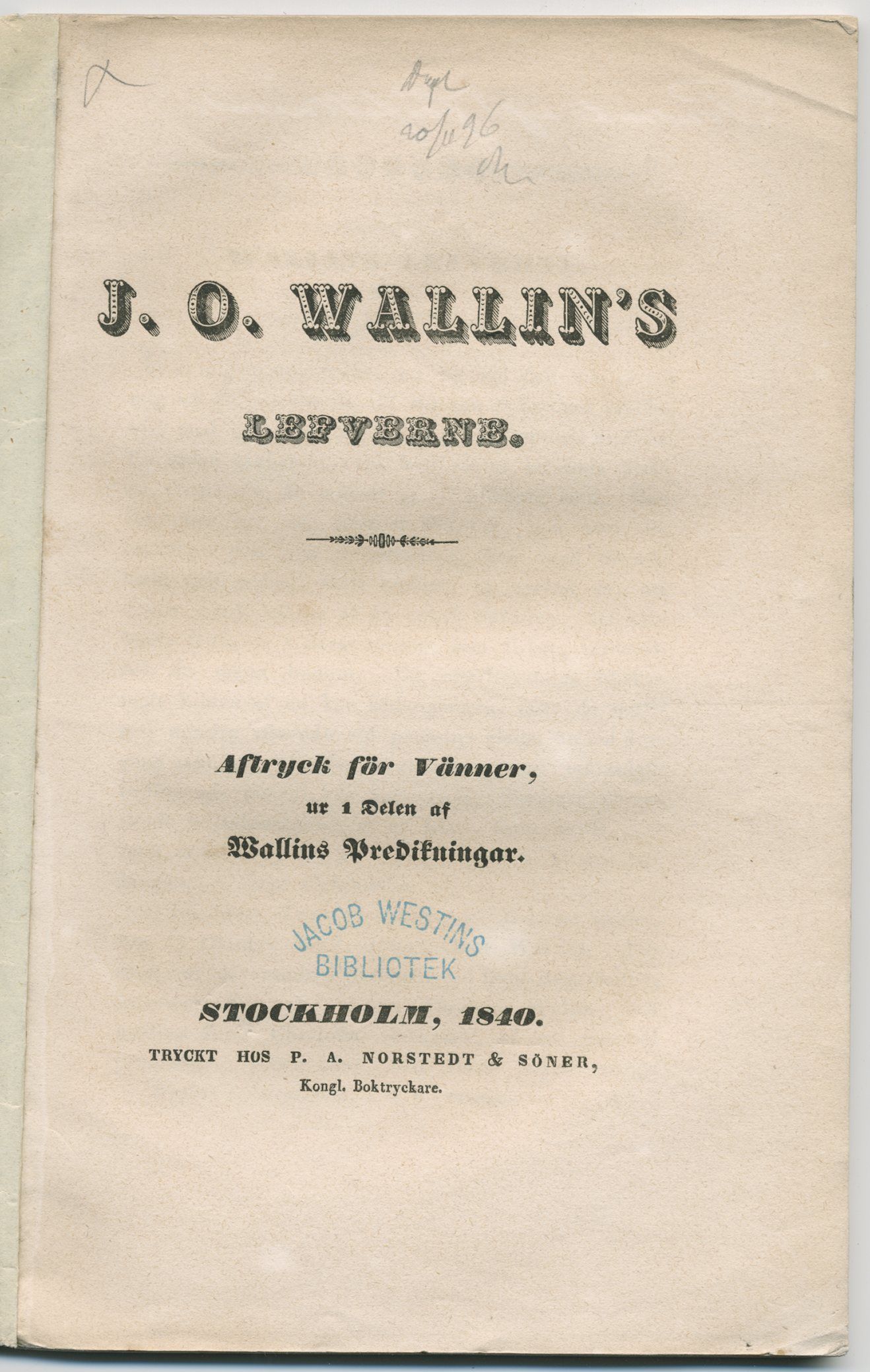 J. O. Wallins lefverne. Aftryck för vänner, ur 1 delen af Wallins Predikningar.